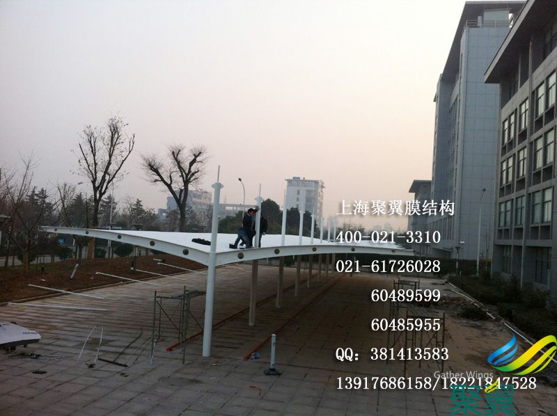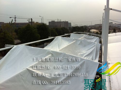 3、造型多變化:國產PVDF膜布材料工藝性好,是具有超強拉伸力的柔性面料,克服一些剛性材料難以制造的復雜空間和曲面變化方案。張拉強度4200N每平方米,可以依靠骨架支撐,也可以依靠膜結構索具制作各異的空間曲面。曲面光潔柔和,鋼柔結合的造型、清晰突出表現主休。