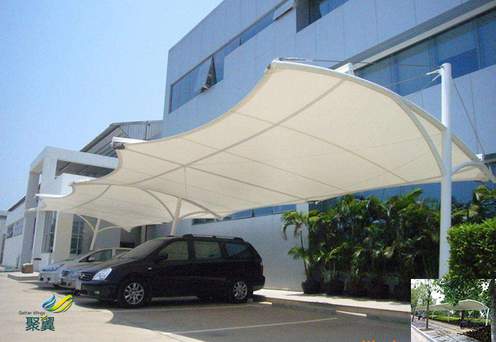 膜結構車棚耐候性:表面有防紫外線的共擠層,可防止太陽紫外線引起的樹脂疲勞變黃。表面共擠層具有化學吸收紫外線并轉化為可見光。對植物光合作用有良好的穩定效果(極適合保護各類車、貴重藝術品及展品,使其不受紫外線破壞)。