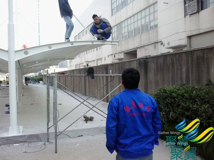 項目類型:自行車停車棚 項目材料:PVDF專業自行車棚遮陽面料 產品系列:大氣上檔次 工程地點:杭州市余杭區 項目預算:大氣上檔次 杭州市余杭區星橋街道自行車雨棚采用PVDF專業自行車棚遮陽面料,經久耐用,美觀大方,下圖為我司工作人員安裝現場: