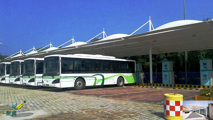 現代車棚規劃設計包括視覺景觀形象 、環境生態綠化 、大眾行為心理三方面。膜結構停車棚已經廣泛應用于大型體育場館、購物場 、娛樂場 、展覽會場 、植物觀光園等區域。在城市車棚中,膜結構停車棚特殊的結構及性能特點使其不僅在車棚領域充滿潛力,在其他的應用上也擁有巨大的發展前景 。
