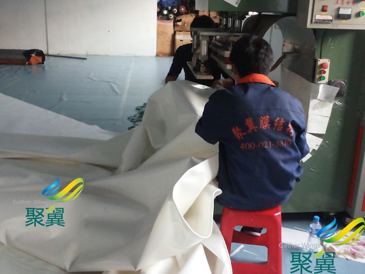材料進場加工制作中,預計于4月20進場安裝(鋼結構與膜布面料同時進場安裝)。車棚主休采用高強度國標鋼管材料,配國產JY-1100gPVC膜布材料.車棚膜布面料現已加工完成。