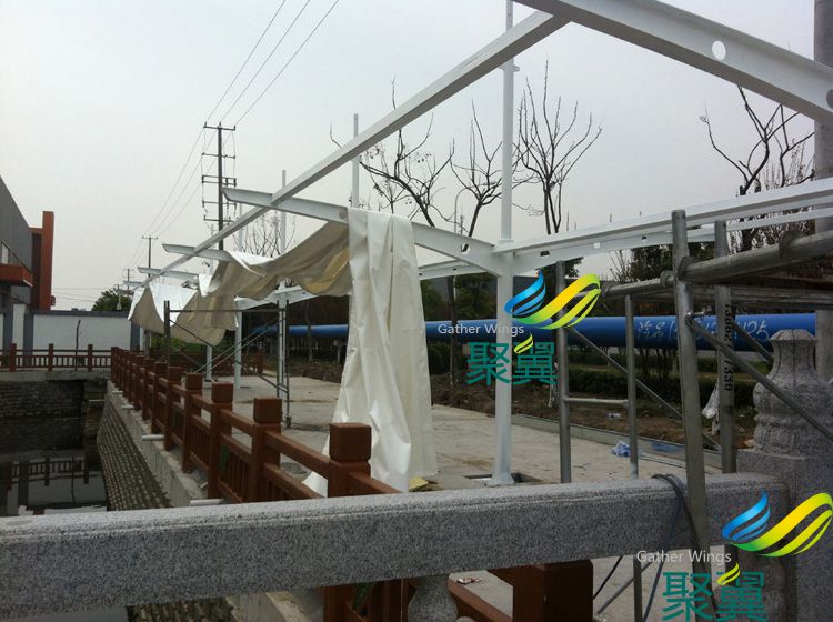 圖2、車棚面料安裝中(見上圖)。