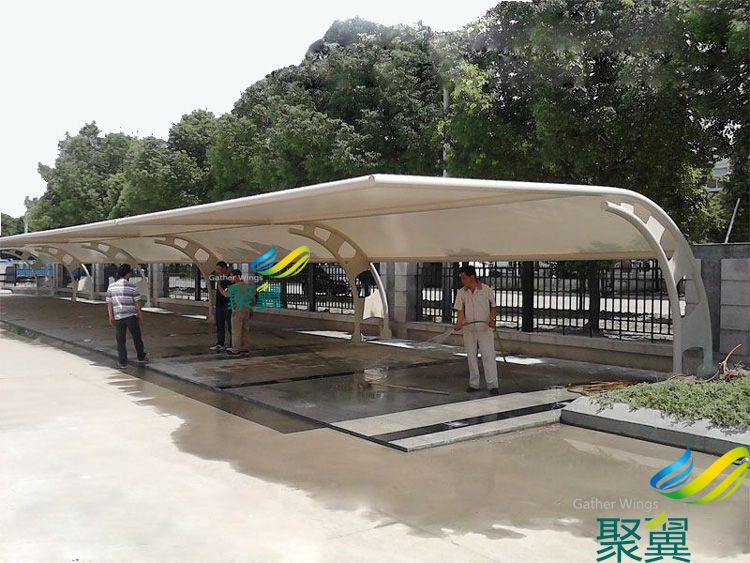JY-90膜結構車棚系列這90S款:車棚主體采用異型鋼結構,精密焊接,表面防銹處理配環氧富鋅專用鋼結構油漆。面料推薦PVC膜布張拉力4000N材料,正常使用情況下質保8年。200-300平方米加工周期約為7天,現場施工安裝工期約為5-7天。為了保證膜結構車棚產品準時交貨,下單后鋼構及膜布材料同時進行精加工,以先后順序合理安排加工和現場施工。