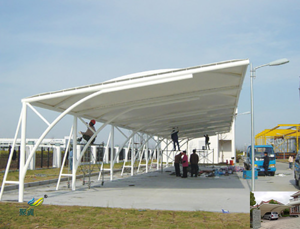 膜結構停車棚是建筑結構中最新發展起來的一種形式,自從膜結構在國外已逐漸應用于體育建筑、商場、展覽中心、交通服務設施等大跨度建筑中。膜結構停車棚具有良好的環保性、透光性、自清潔性、膜材表面采用pvdf涂層、或二氧化鈦涂層,具有較好的隔熱效果,對太陽能可反射掉70%,膜材本身吸收了17%,傳熱13%,而透光率卻在20%以上,經過10年的太陽光直接照射,其輝度仍能保留70%。