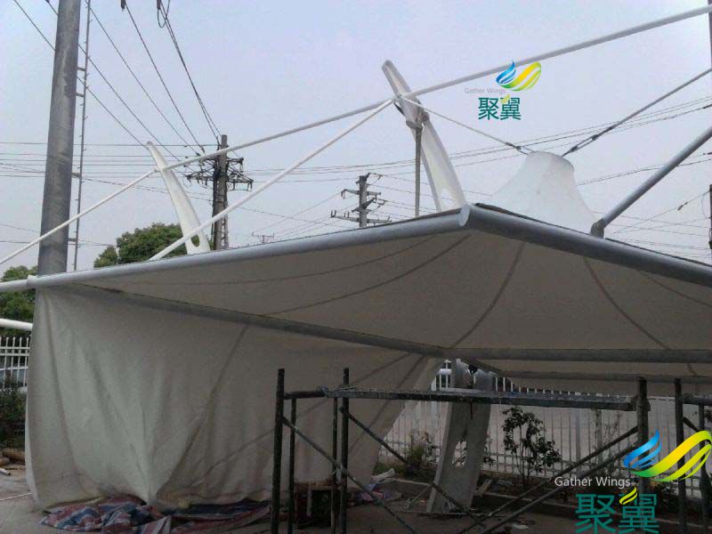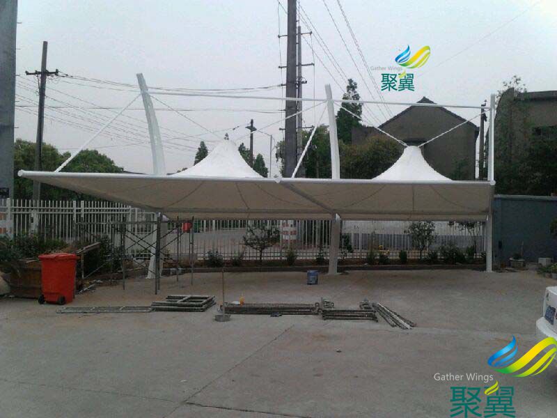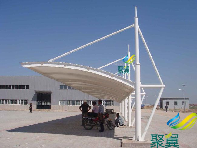 膜結構停車蓬良好的自潔效果在雨水的沖洗下還原如新。膜結構自重輕,結構簡單可靠,鋼架30年不變形。聚翼膜結構產品選用的材料是經過專家們的反復測試(抗風、抗震、抗壓、耐熱、防凍、防雨等等),面料顏色有多種,停車篷的膜面料壽命在8年-25年不等