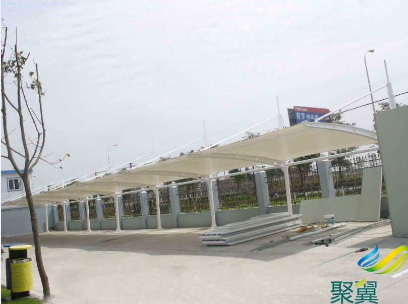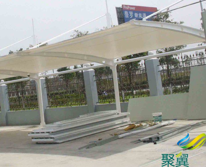 廠區膜結構車棚JY20抗風力好,耐久性強,對熱能反射率73%壽命長。