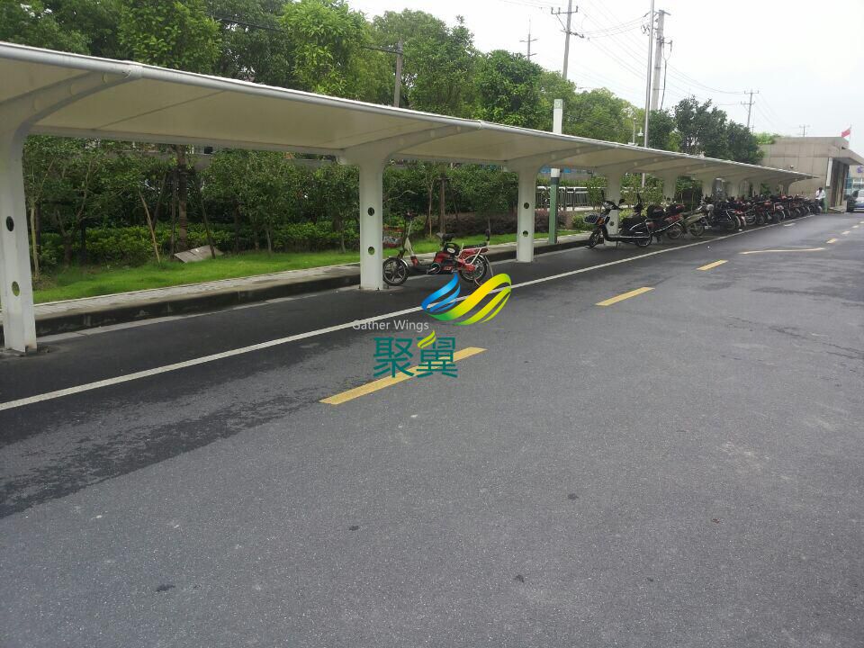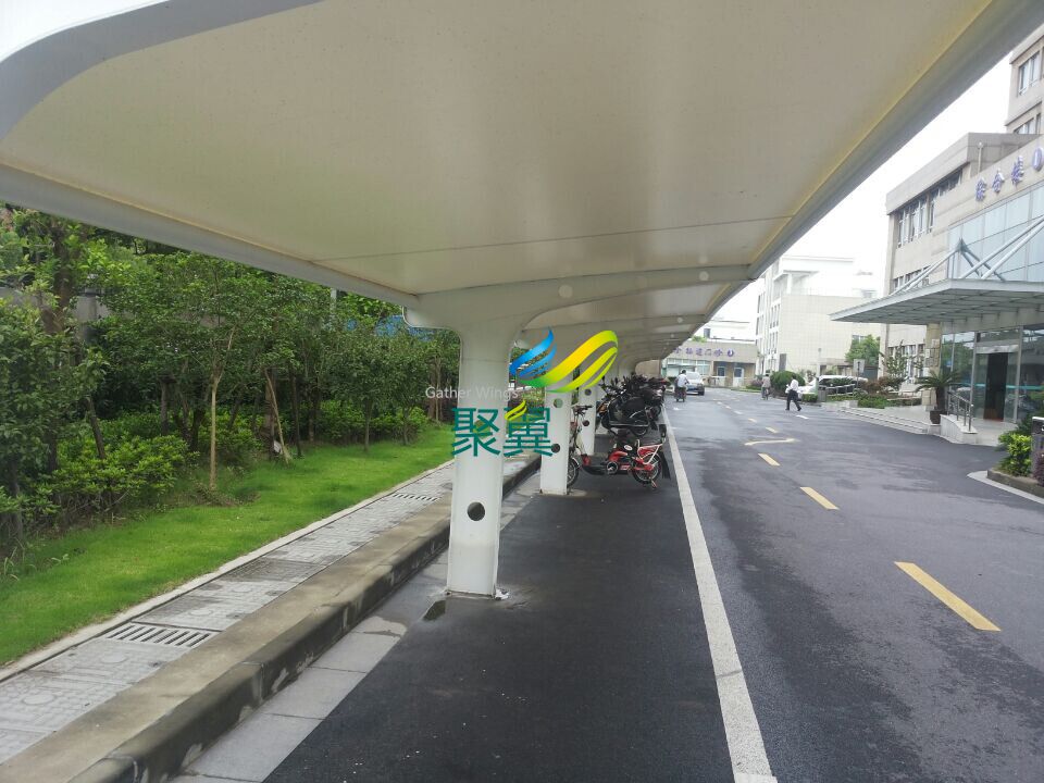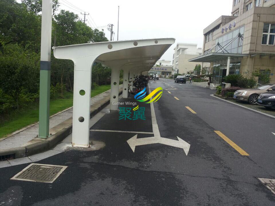 上海松江九亭衛生院自行車棚主要用于兩側的人行道,由于空間比較有限,所以我們的自行車棚的尺寸一般伸展長度為:2.7-4米(汽車棚伸展長度在6-8米)立柱間距為5-6米,也可以安自行車停車位的部長度平均分部,如果有障礙的情況下會考慮到分開或與現場的障礙結合的方式來處理好需要遮陽防護的區域。 上海松江九亭衛生院自行車棚展示圖:(圖1)
