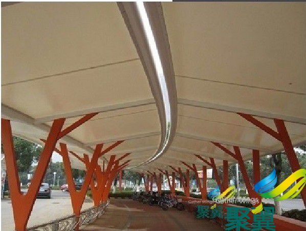 浙江平湖公安局雙開自行車棚立柱間距6米,伸出3米,立柱高4.5米,自行車棚骨架采用Q235鋼材料,膜布面料采用PVC960g膜材料。自行車棚款式多樣,根據現場尺寸量身定制。遮陽效果好,防水防火安全穩定性強!聚翼自行車棚加工廠全國配貨安裝,產品多樣化款式及材料方案。24小時客戶咨詢熱線:400-021-3310
