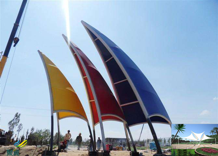 2、張拉景觀膜結(jié)構(gòu)對(duì)于同等大小的建筑,如果采用膜結(jié)構(gòu),其成本只相當(dāng)于傳統(tǒng)建筑的二分之一或更少,特別是在建筑短期應(yīng)用的大跨度建筑時(shí),就更為經(jīng)濟(jì)。