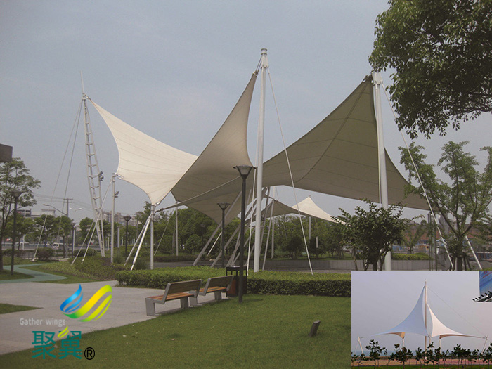 4、景觀膜結構火和抗震性,它能夠很好的滿足防火要求。因為結構重量輕,膜結構的膜材料具有極好的阻燃性和耐高溫,加上柔性結構且有較大變形能力,故抗震性能好。