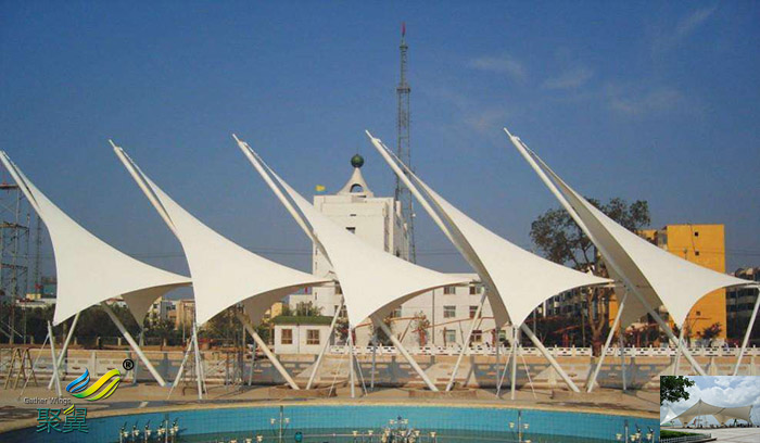 景觀膜結構自身的優點還是蠻多的,最大的優點就是外觀因素了,相信大家可以看到,各式各樣的外觀,歐式的建筑風格,非常的具有吸引力,滿足了人們的使用要求,還給城市添加了色彩,在有些城市已經成了標志性建筑物。其自身的透光度很高達到了8~15%之間,在太陽下暴曬也不會產生發黃、變形等因素。夜晚路燈照射在棚頂可以折射出艷麗的光彩。