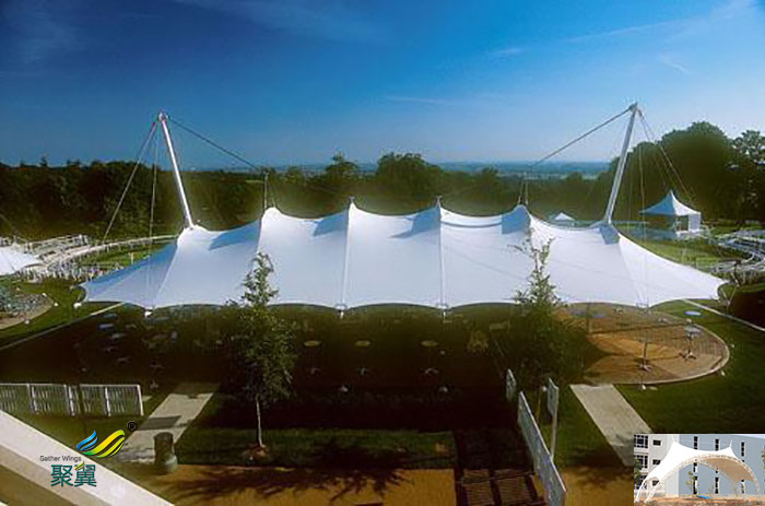 舞臺建筑膜結構被人們廣泛應用于各類新型建筑。那么,膜結構常用的材質有哪些?玻纖PVC:為提高PVC本身的耐老化性能,涂層加入一些光、熱穩定劑,淺色透明產品加一定量的紫外吸收劑,深色產品加炭黑做穩定劑,也可以在PVC上層壓一層極薄的金屬薄膜或噴射鋁霧,用云母或石英來防止表面發粘和沾污。玻纖有機硅樹脂:具有非常好的耐高低溫、拒水、抗氧化等特點,舞臺建筑膜結構有較高的抗拉強度和彈性模量,有良好的透光性。這種膜材應用的不多,生產廠家也較少。PTFE:PTFE膜材無疑是的,以超細玻璃纖維織物為基材涂以聚四氟乙烯樹脂(PTEF)而成。優點:阻燃、抗老化、抗紫外線、防污自潔性能好、較好的焊接性能;ETFE。由ETFE(乙烯-四氟乙烯共聚物)生料直接制成。優點:抗沖擊性、抗電、熱穩定、耐化學腐蝕、機械強度高、加工性能好、應用范圍廣、透光性能好、質量輕、延展性高等特點。