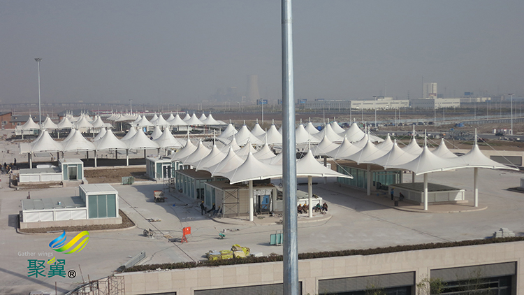 帽頂膜結構車棚、汽車棚、遮陽雨棚、停車棚款式造型可以根據停車區域設計,客戶形象需求設計、合理設計、聚翼提供專業精英設計師團隊為您量身定制,提供(免費)上門測量、設計出案、來圖來樣加工制作、施工承包 、輕包工、完善售后等服務,歡迎來電洽談合作,預約咨詢請撥打(全國統一客服熱線)4008-613-119。