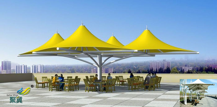 膜結(jié)構(gòu)廣場膜傘作為現(xiàn)代空間結(jié)構(gòu)體系的一個重要分支,膜結(jié)構(gòu)是一種全新的建筑結(jié)構(gòu)形式,除豐富多彩的造型外,還有優(yōu)異的建筑特性、結(jié)構(gòu)特性和適宜的經(jīng)濟(jì)性。而膜結(jié)構(gòu)遮陽傘不僅具有超強(qiáng)隔熱能力,造型設(shè)計時尚美觀的特點,其還具有良好的遮陽擋雨的功效。