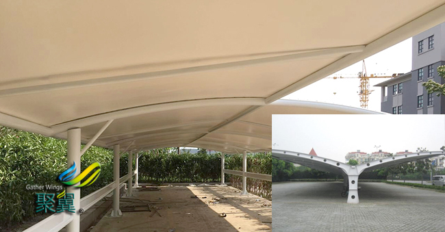 膜結構車棚所用膜材料由基布和涂層兩部分組成.基布主要采用聚酯纖維和玻璃纖維材料;涂層材料主要聚氯乙烯和聚四氟乙烯。膜結構車棚PVC材料的主要特點是強度低、彈性大、易老化、徐變大、自潔性差,但價格便宜,容易加工制作,色彩豐富,抗折疊性能好。為改善膜結構車棚性能,可在其表面涂一層聚四氟乙烯涂層,膜結構車棚提高其抗老化和自潔能力,其壽命可達到15年左右。