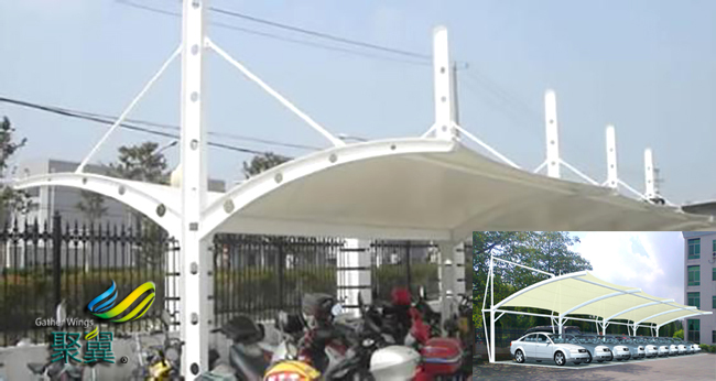 人們生當今活提高水平,很多公共休閑場所會有很多膜結構車棚,另外還有些停放車輛的汽車棚,停車棚等,膜結構車棚是近年來在國內開始流行的一種新式的車棚結構。