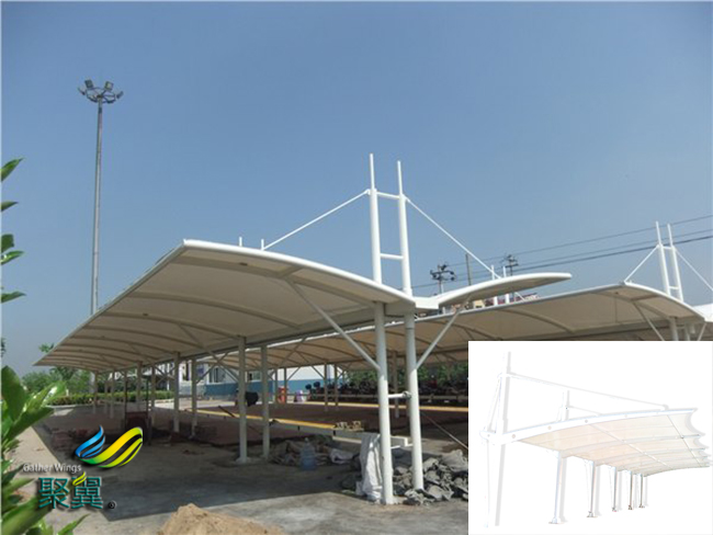 膜結構車棚棚在*初是作為一種能提供給車輛停泊的地方,使車輛避免了直接面對風吹雨打。用來保證自行車,汽車等在膜結構車棚下不受損傷。在膜結構車棚未出現之前,市場主要的是鐵制車棚,鋁合金車棚,彩鋼車棚等。這些車棚都是采用金屬構件來制作,因此具有笨重,形式單調的缺點。