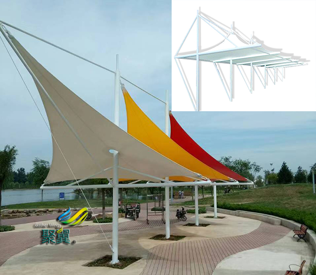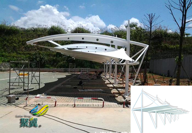 膜結(jié)構(gòu)車棚一種作為屏障,用來(lái)保護(hù)車輛不受損傷的一種建筑,主要起到擋風(fēng)遮雨的功能,還有膜結(jié)構(gòu)車棚也是一件難得藝術(shù)品。