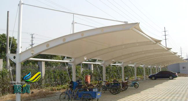 膜結構車棚遮陽棚,時尚氣息*常的顯著,一些膜結構車棚被涂裝成了鮮艷,特別的色彩和圖案。