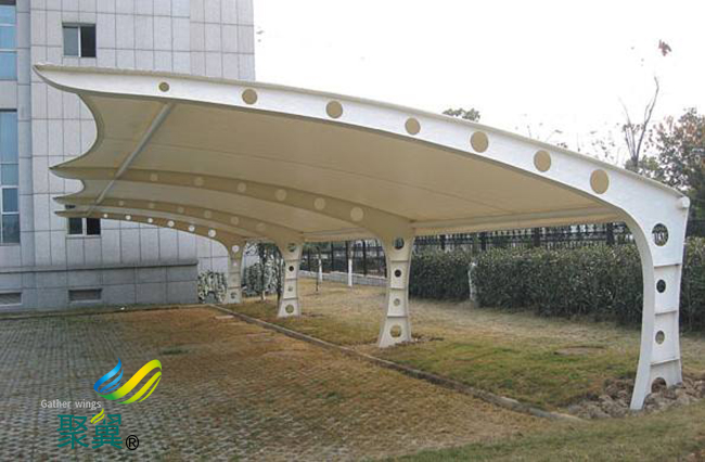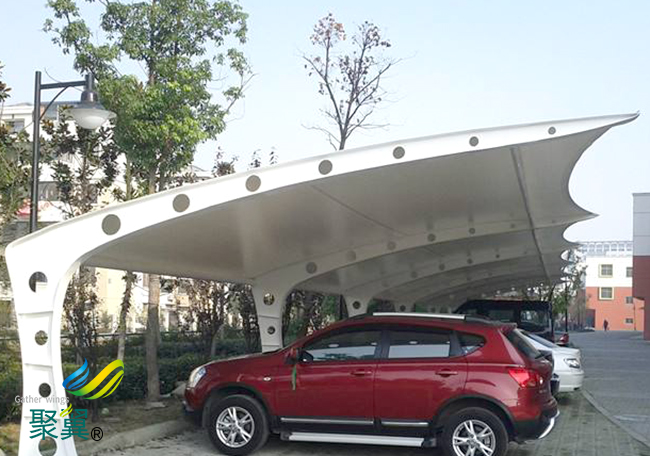 膜結構車棚PVC材料的主要特點是強度低、彈性大、易老化、徐變大、自潔性差,但膜結構車棚價格便宜,容易加工制作,色彩豐富,抗折疊性能好。