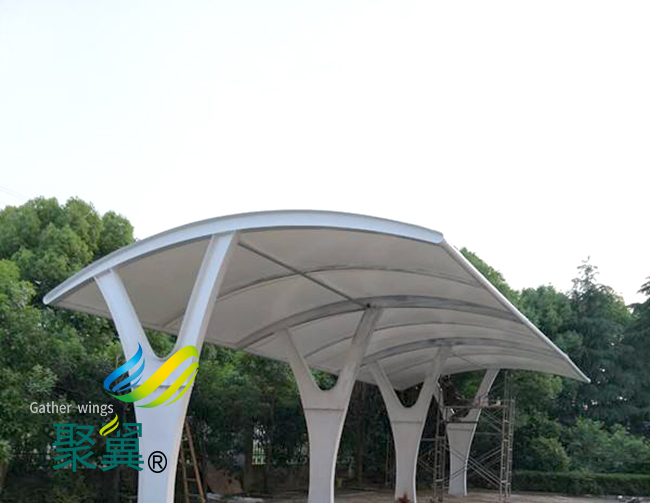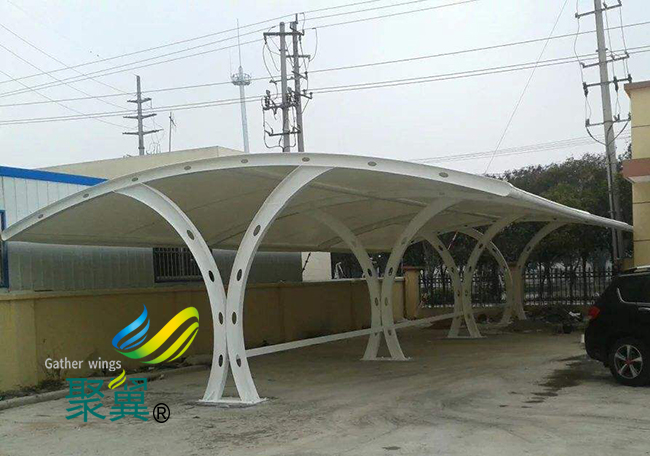 膜結構車棚PVC材料的主要特點是強度低、彈性大、易老化、徐變大、自潔性差,但膜結構車棚價格便宜,容易加工制作,色彩豐富,抗折疊性能好。