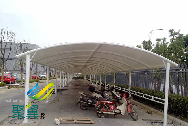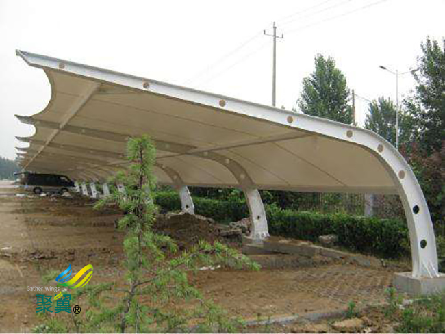 膜結構車棚施工精度要求高,結構功能強,且膜結構車棚具豐富的表現力,所以造價略高于骨架式膜結構車棚。