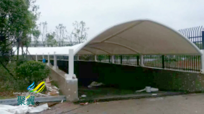 膜結(jié)構(gòu)車棚身上,因?yàn)槟そY(jié)構(gòu)車棚的支撐主體是高頻焊接的鋼結(jié)構(gòu),地震傳遞的剪應(yīng)力最多能把鋼結(jié)構(gòu)局部拉彎,而膜結(jié)構(gòu)車棚膜材是使用特殊的拉膜板進(jìn)行多邊固定的,即使出現(xiàn)撕裂情況,也不會掉落。