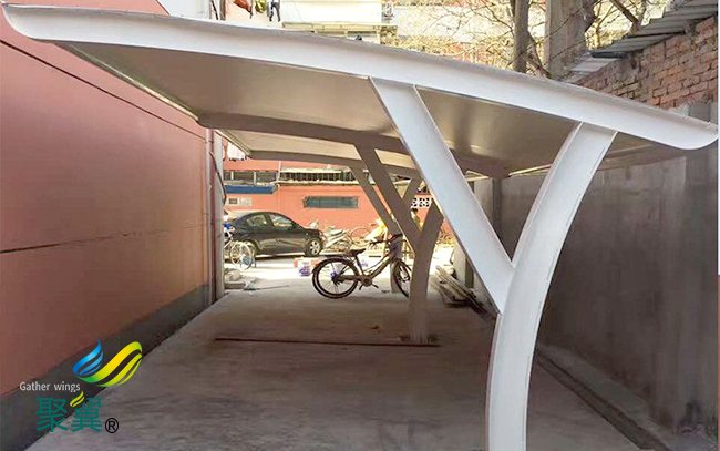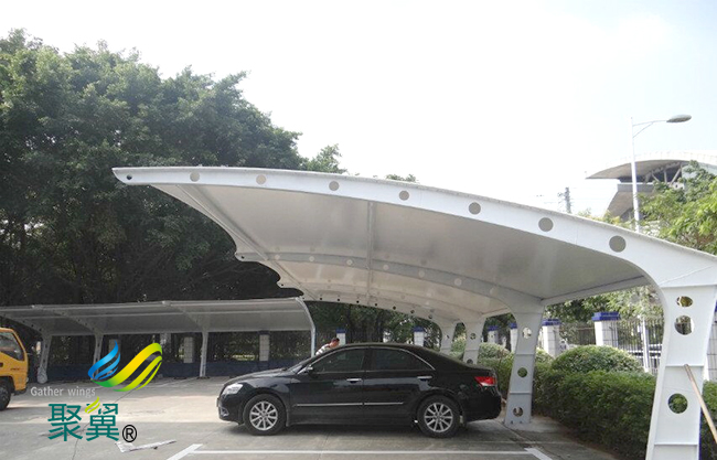 膜結構車棚PVC材料的主要特點是強度低、彈性大、易老化、徐變大、自潔性差,但膜結構車棚價格便宜,容易加工制作,色彩豐富,抗折疊性能好。