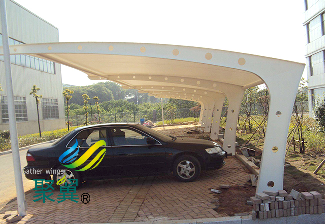 膜結構車棚選用進口PVDF膜材料配鋼結構骨架,表面處理采用進口船用底漆,炳烯酸聚氨酯面漆藝術性:除了一般遮陽棚不可比擬的實用、耐用、遮風擋雨的功能外,膜結構車棚更是一座雕塑,一件藝術品,給人美的視覺享受。