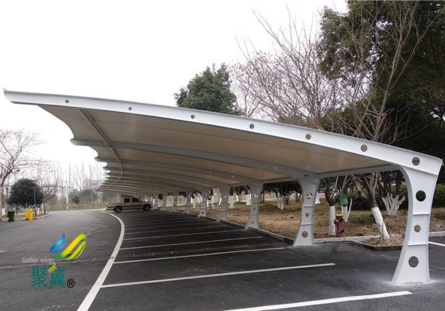 例行維護,膜結構車棚是能承受一定的外荷載作用的一種空間結構形式因此主要是對膜結構車棚處于不正常狀態(tài)時候進行調節(jié),不正常狀態(tài),應采取預張力補強或其他措施,連接件如有松動會重新擰緊或予以加固等等方法。