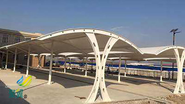 膜結構車棚工程使用同一批號的膜材。保證膜材表面應無針孔,無明顯褶皺和明顯污漬,不應出現斷絲、裂縫和破損等,色澤應無明顯差異。