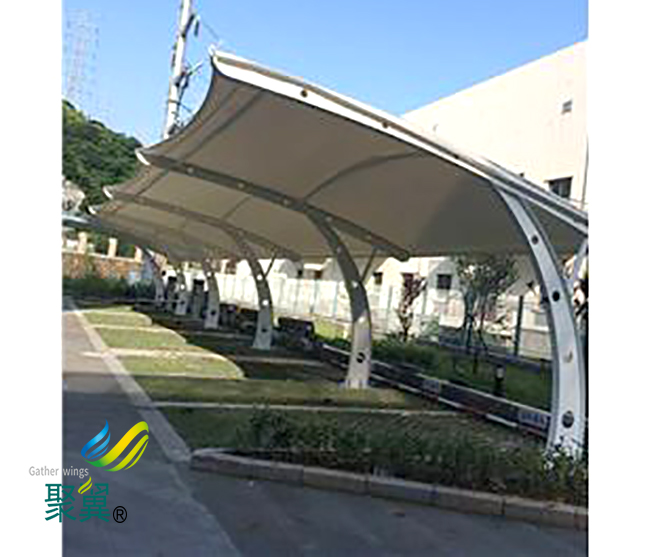 膜結構車棚自潔性。膜結構建筑在設計的時候本身外層具有一定的防護涂層,這種涂層帶有很好的自身清潔的作用,可以有效延長膜結構車棚的使用壽命。