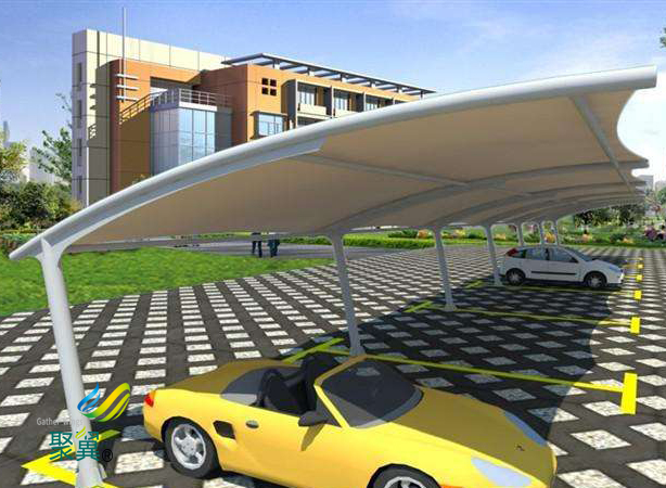 膜結構車棚是由上面造型獨特的膜材質和下面骨架的鋼結構、鋼索 組成的,現場裝置即可完結。