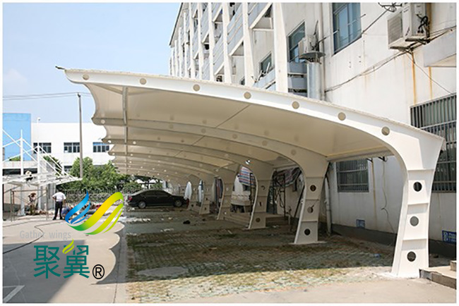 膜結構車棚PVC材料的主要特點是強度低、彈性大、易老化、徐變大、自潔性差,但膜結構車棚價格便宜,容易加工制作,色彩豐富,抗折疊性能好。