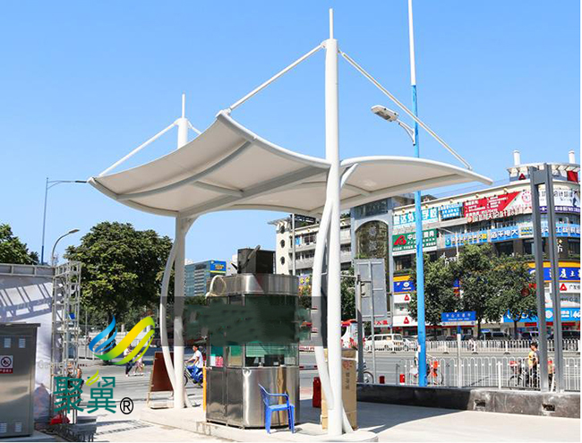 膜結構車棚耐候性:表面有防紫外線的共擠層,可防止太陽紫外線引起的樹脂疲勞變黃。膜結構車棚表面共擠層具有化學吸收紫外線并轉化為可見光。對植物光合作用有良好的穩定效果(極適合保護各類車、貴重藝術品及展品,使其不受紫外線破壞)。