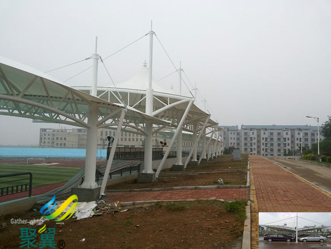 首先,車棚是一種公用建筑物,是由建設單位出資進行修建,所以這種產品的首要要求就是耐用穩固,金屬車棚都是金屬支撐柱,然后其上進行焊接等工藝加裝頂棚。如果是采用的聚碳酸酯材料作為頂棚的話,采用螺栓固定。相對于膜結構來說,整體能承受的載荷會小很多,遇到劇烈的暴風雨天氣,頂棚會和支撐件分離。而膜結構受力點小,單位尺寸上能承受的壓強高,因此在多次的實踐中,江蘇省南通市海安縣膜結構車棚都穩固如山。 江蘇省南通市海安縣膜結構車棚的透光性:金屬車棚的頂棚一般都是采用聚碳酸酯材料或者是彩鋼板,二者的透光性和膜結構相比,膜結構材料的透光性更好,而且膜結構作為一種高分子布的話,不會因為長時間的直曬變黃,也不會物理特性發生變化,比如變脆,軟化等現象。 車棚的重量輕,膜結構車棚布是一種建筑織物,能承受高強度的沖擊和拉伸,而且可以任意變形。因此膜結構在行業內有“不破玻璃”的稱號。同時成本只有其它結構車棚的一半或者更少。藝術性:江蘇省南通市海安縣膜結構車棚最值得一提的是它可以根據支撐構件的位置和高低排列組成不同的形狀,這在金屬車棚上是無法想象的。如在車棚頂部通過拉伸索,使膜結構布邊沿向上翻起。這要是在彩鋼上只能通過對彩鋼板進行預熱加工才行,需要耗費極大的代價。而在膜結構材料上,通過支撐和張拉索就能構成。所以江蘇省南通市海安縣膜結構車棚可以通過自身柔美的曲線和周圍的藝術景觀結合起來,給人以美的享受。在進行江蘇省南通市海安縣膜結構車棚的荷載態響應分析時,需考慮以下荷載及作用:恒荷載、活荷載、雪荷載、風作用、預張力、支承及邊界構件的變形、地震作用以及溫度變化的影響等等。