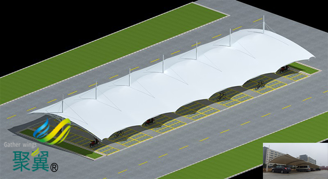 膜結(jié)構(gòu)車棚是由多種高強(qiáng)薄膜材料及加強(qiáng)構(gòu)件(鋼架、鋼柱或鋼索)通過一定方式使其內(nèi)部產(chǎn)生一定的預(yù)張應(yīng)力以形成某種空間形狀,作為覆蓋結(jié)構(gòu),并能承受一定的外荷載作用的一種空間結(jié)構(gòu)形式。湖南省衡陽(yáng)市城南區(qū)