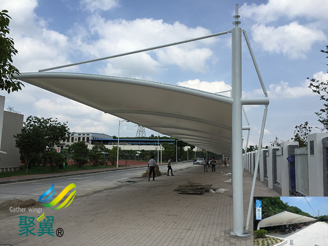 4、河北省邯鄲省大名縣膜結構車棚膜結構的后期費用維護費用較低,鋼結構后期做到定期檢查鋼結構的銹蝕程度,一般一道兩年可以做一下防銹檢查。膜布自身具有一定的自潔性,只要當地每月有一定的雨水,大部分的灰塵是可以被沖刷掉的,如果長期無雨水,使用單位可以定期用水沖洗膜布,再多的灰塵都能洗掉的。洗完之后就跟新的一樣。所以膜結構也是一種一次性投資的消費行為。河北省邯鄲省大名縣膜結構車棚指的是利用張拉膜結構制作的具有實用性和景觀性的車棚。