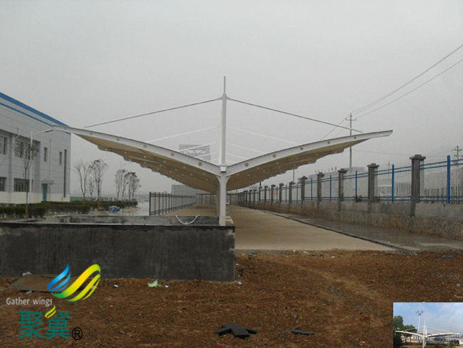 在替換之前,需對鋼框架、鋼索、夾板、螺栓、螺母和墊圈等其他結構元件進行檢查以便決定是繼續使用還是予以更換。對繼續使用的夾板和鋼件都應進行清洗,并檢查是否發生了腐蝕。應將所有的腐蝕層予以除去,并采取充分的保護措施。腐蝕嚴重的構件和已損壞鋼索等應予以全部替換。福建省寧德市古田縣膜結構車棚俗話說:‘人再美麗,都會老的時候’。同樣的道理,福建省寧德市古田縣膜結構車棚剛建筑起來還是很美麗的,時間長了也會經過風吹日曬,抵擋不住時光歲月的流逝。既然外在因素我們無法控制,那么可以主觀方面來延緩使用壽命: