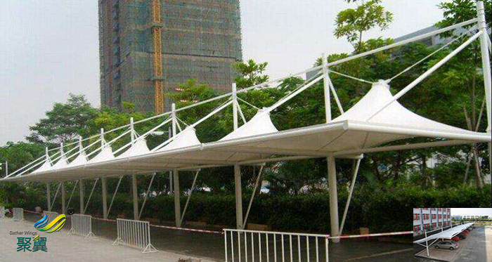 膜結構車棚,是以建筑織物,即膜材料為張拉主體,與支撐構件或拉索共同組成的結構體系,它以其新穎獨特的建筑造型,良好的受力特點——成為大跨度空間結構的主要形式之一。膜材料是指聚酯纖維基布或PVDF、PVF、PTFE等不同的表面涂層,配以優質的PVC組成的具有穩定的形態,并可承受一定載荷的建筑紡織品。它的壽命因不同的表面涂層而異,一般可達成10-20年。