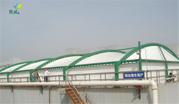 污水處理廠擔負著廢水排放的處理工作,是十分重要的一項環保工程,但是污水處理就不得不在一些池子中進行沉淀、過濾,而池中散發的臭氣其實也是一種空氣污染,所以對污水池進行加蓋就成為了一種新的環保項目。傳統的玻璃鋼加蓋雖然可以做到密閉、集氣,但使用壽命較短,而且還容易造成腐蝕產生新的污染,所以反吊膜結構污水池棚罩就成了新的選項,下面七色小編就帶大家看看反吊膜結構在污水池的應用與常見安裝方式。