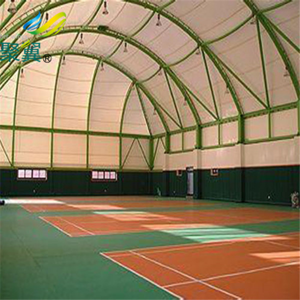 膜結構建筑的支撐一般為鋼結構,國內對于鋼結構的保護多采用涂防火涂料。國外類似建筑大多是不涂防火涂料的。還有一種更為穩妥的辦法:就是在構造上作處理,使膜面緊貼在鋼索下面,火災中煙氣首先面對的是膜面,這樣鋼索下面又多了一個保護層,使鋼架不受任何高溫作用。