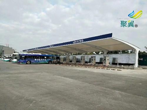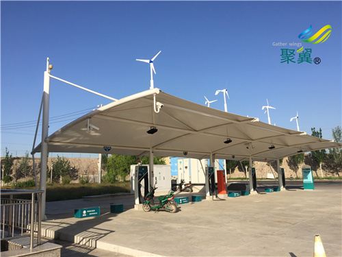 膜結構就開始走下坡路。膜結構充電樁車棚因為膜結構的張力很強,在較大的距離內都不需要鋼鐵的支撐。所以這就能節省很多材料。但是由于特氟龍膜的保溫效果不好,當冬天燒暖氣時,外面的風會將里面的熱氣帶走,于是我們就研制了一種絕熱的內襯,叫做透明隔熱層。膜結構充電樁車棚將這個隔熱層置于布中,就能達到很好的保溫效果,同時還能抵制夏天室外的熱氣,冬暖夏涼。只要能將保溫工作做好,那么用來燒暖氣的燃料自然就減少了,這也就達到了節能的要求。所以現在完全是按照綠色建筑的標準去設計建筑。