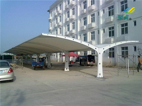 四、膜結構車棚懸掛臂安裝焊接:懸掛臂安裝采用焊接,需檢查焊接節點,調節懸掛臂設計坡度,準確無誤方能進行焊接。靠邊一條懸掛臂準確無誤后,膜結構車棚安裝另一邊一條懸掛臂,就位準確后點焊。