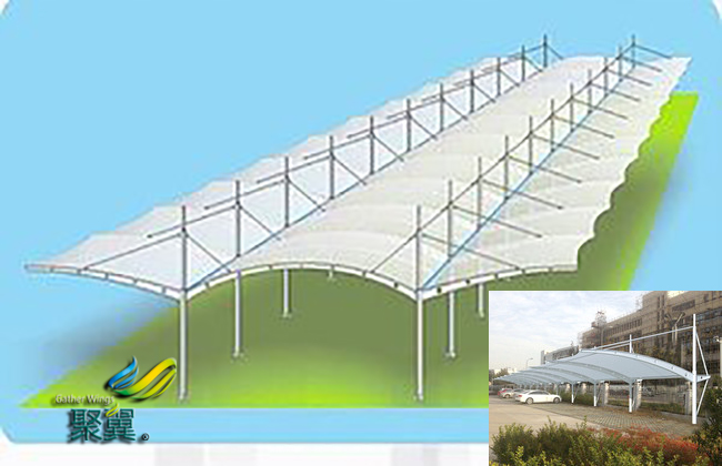 膜結構車棚選用進口PVDF膜材料配鋼結構骨架,表面處理采用進口船用底漆。