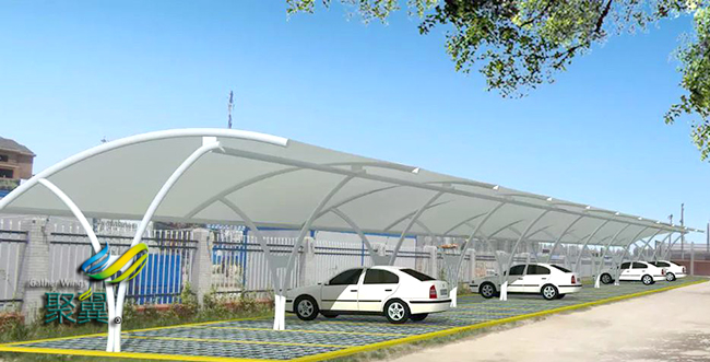 膜結構車棚是一種公用建筑物,是由建設單位出資進行修建,所以這種產品的首要要求就是耐用穩固,金屬車棚都是金屬支撐柱,然后其上進行焊接等工藝加裝頂棚。如果是采用的聚碳酸酯材料作為頂棚的話,采用螺栓固定。