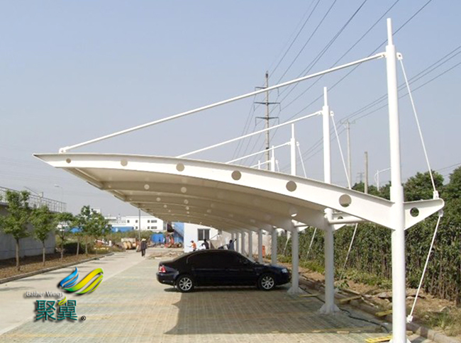 膜結構車棚抑制車內溫度上升(有效抑制由于太陽直射引起的車內高溫,進蒸籠的感覺不見了。)膜結構車棚連接設計:包括螺栓、焊縫和次要構件尺寸。膜結構車棚剪裁設計:這一過程應具備必要的試驗數據,包括所選用膜結構車棚膜材的楊氏模量和剪裁補償值(應通過雙軸拉伸試驗確定)。