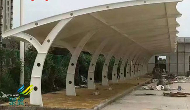 膜結構車棚膜材及其支承構件(鋼結構)組成的建筑物或構筑物,膜結構車棚膜材,由高強度纖維織成的基材和聚合物涂層構成的復合材料。