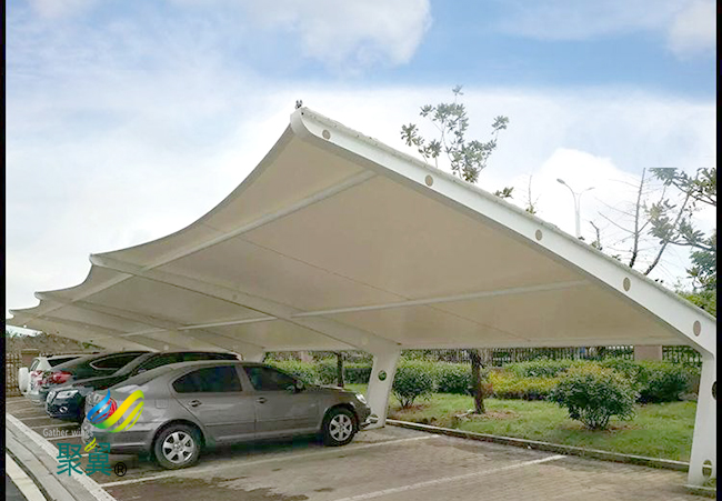 自潔性。膜結構車棚膜建筑中采用具有防護涂層的膜材,本身不發黏,落到膜材表面的灰塵可以靠雨水的自然沖洗而達到良好的自潔效果,同時保證膜結構車棚建筑的使用壽命。