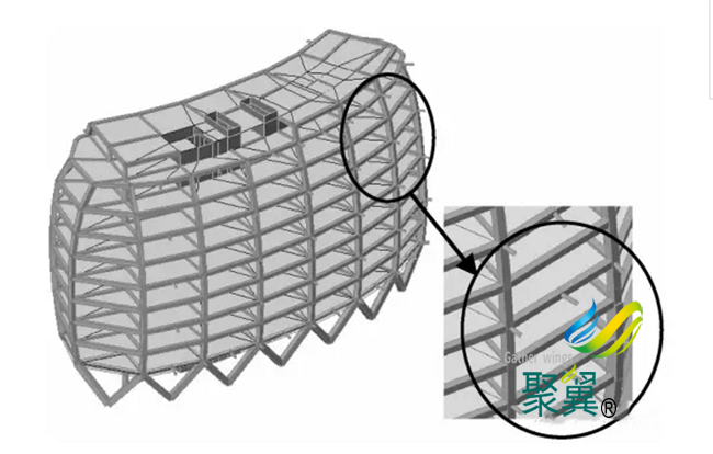 (4)鋼結構內的通天梯及旋轉坡道,見圖2。通天梯為寬度3.2m,水平投影總長約43m的鋼結構,下端固定端鉸接于演播樓的層5;上端滑動端支承在辦公樓層9中間的設備夾層上。旋轉坡道為寬度3m,總長235m的鋼結構,將演播樓的層2~4與辦公樓的層2~4連通,分別支承在演播樓、辦公樓以及外殼鋼結構上,局部設拉索及支桿。